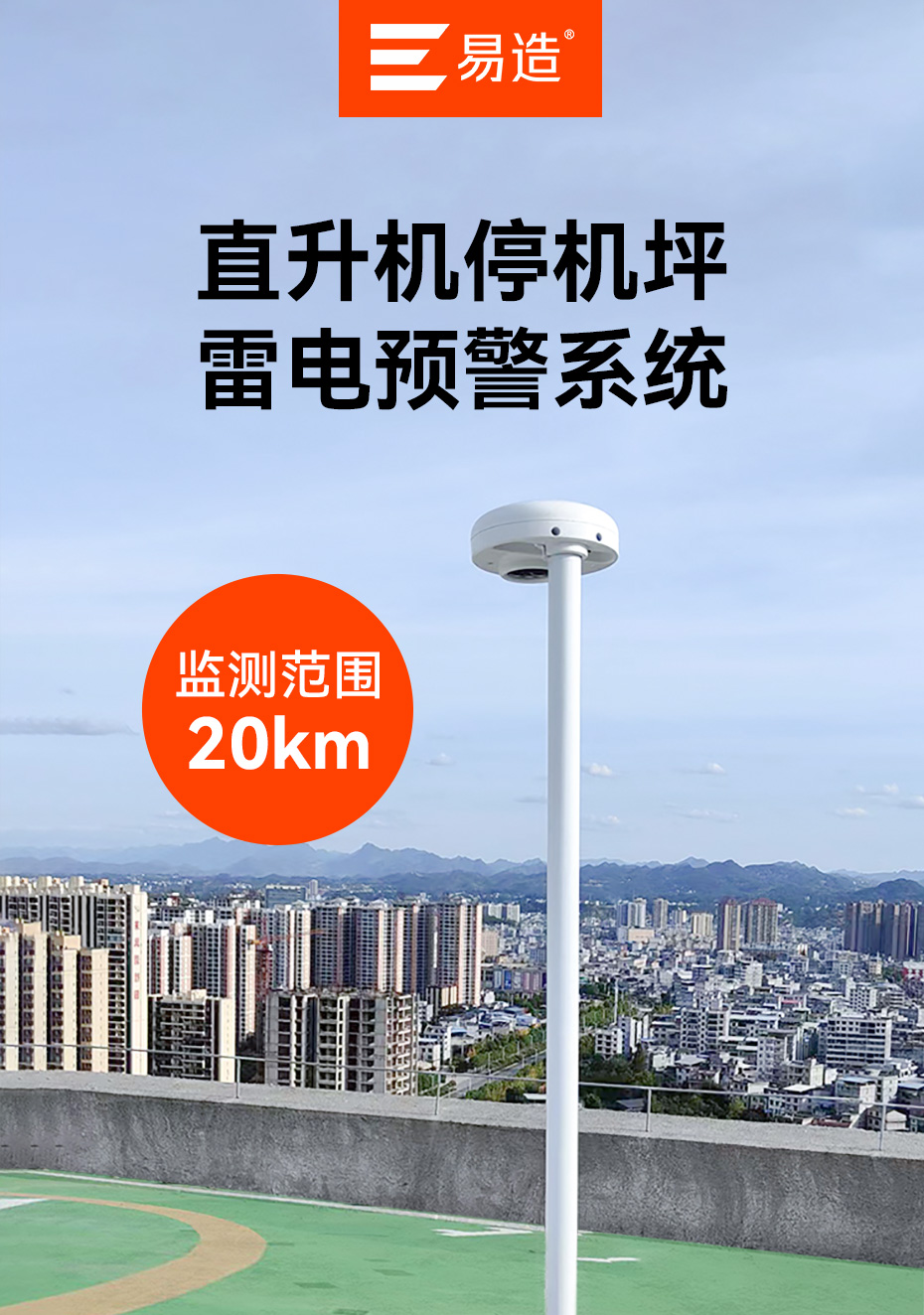 易造场磨式雷电预警系统,采用新一代双算法预警技术,预警准确无漏报,具备良好的抗干扰和耐恶劣环境能力,为停机坪的主动防雷提供持续、准确的雷电预警服务,适用于高层建筑停机坪、医院停机坪、机场、航空航天等领域。