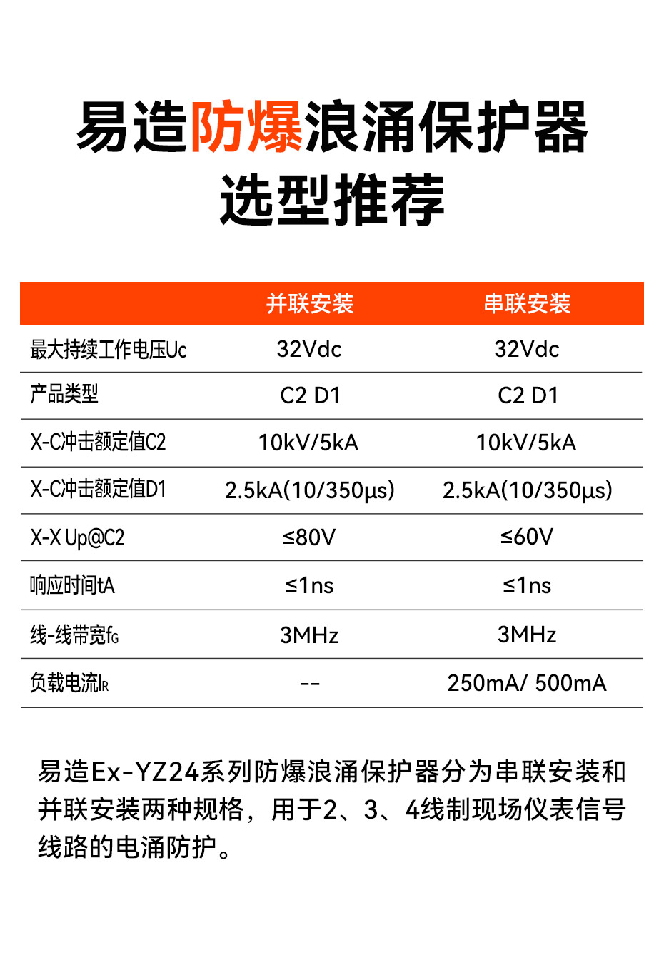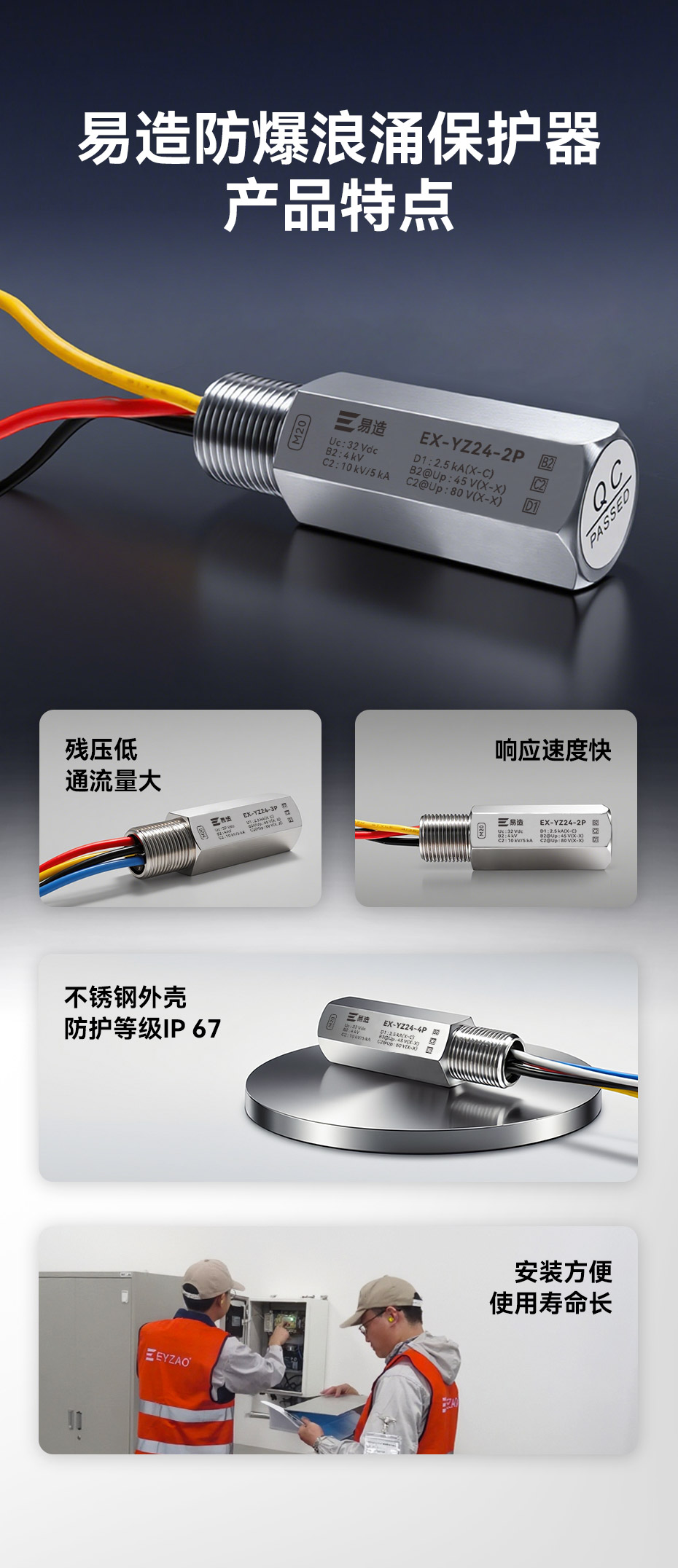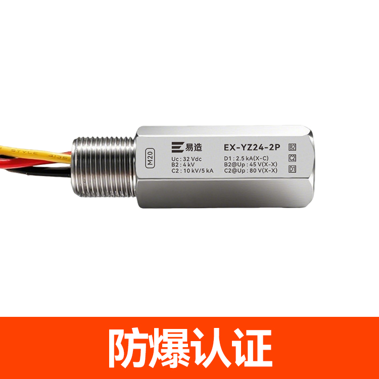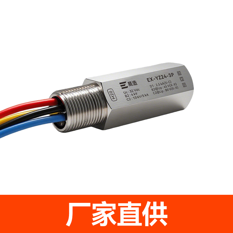 防爆浪涌保护器又名防爆信号防雷器、管式电涌保护器、现场仪表防雷器,易造Ex-YZ24系列防爆浪涌保护器依据GB/T18802.21设计,适用于石油化工、油库、天然气等易燃易爆区域及环保、新能源等行业现场仪表的电涌防护,安装接口可以根据客户的要求定制。