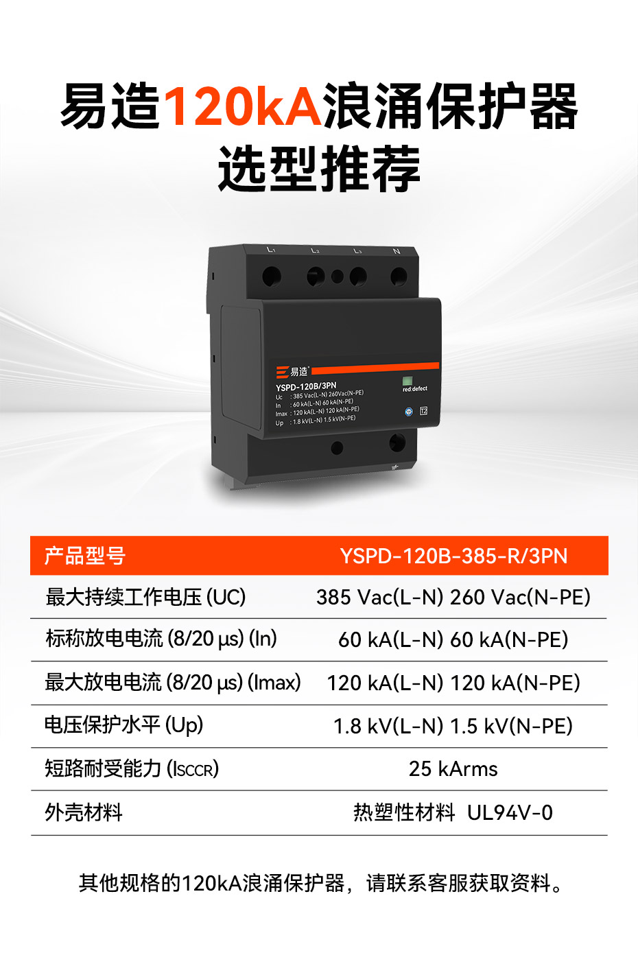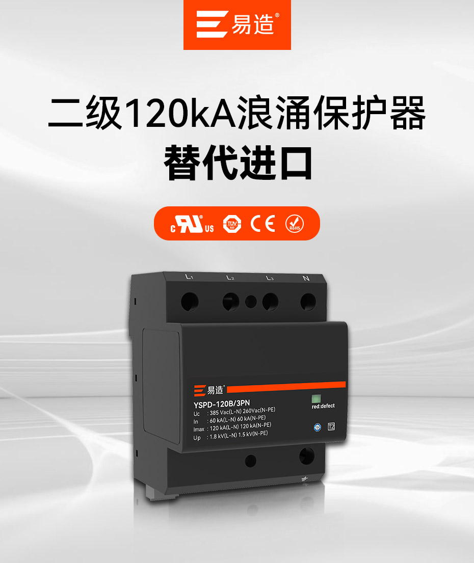 易造120kA二级浪涌保护器,小体积大通流适用于各种供配电系统的单相和三相保护带本地和远程告警功能,安装简单、维护方便可用于3000米以上的高海拔地区。