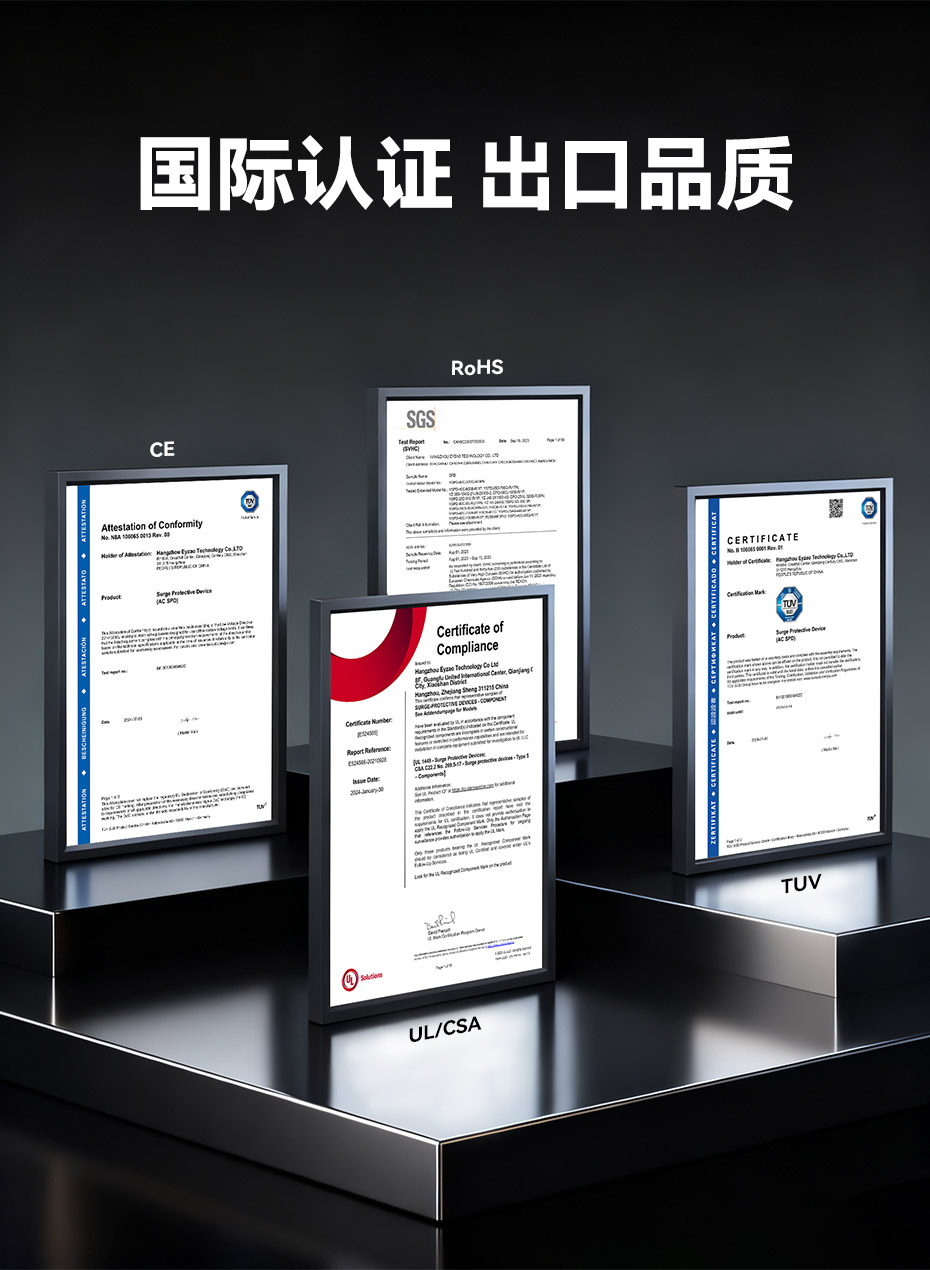 易造T2级大通流浪涌保护器,拥有UL、TUV、CE等国际质量认证,符合全球市场的最高安全和RoHS欧盟环保标准,可替代进口品牌SPD,支持出口。