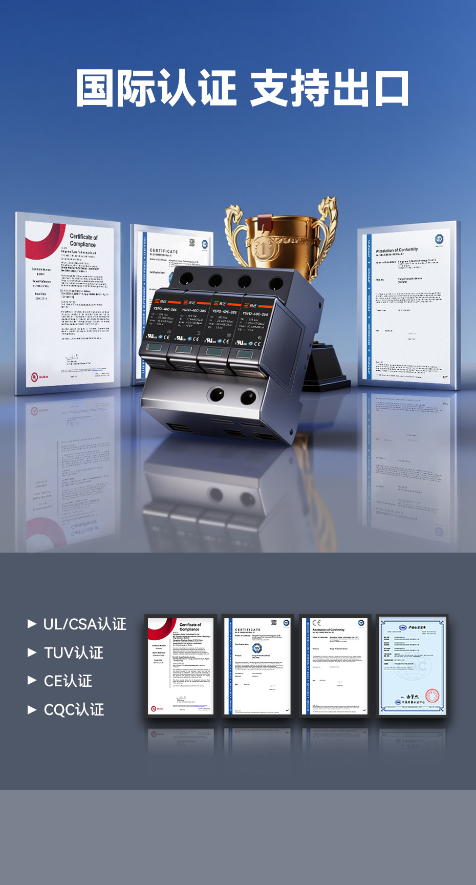 易造易造T1级、T2级、T3级浪涌保护器拥有UL、CSA、TUV、CE、CQC等国内外质量认证,资质齐全,稳过验收。