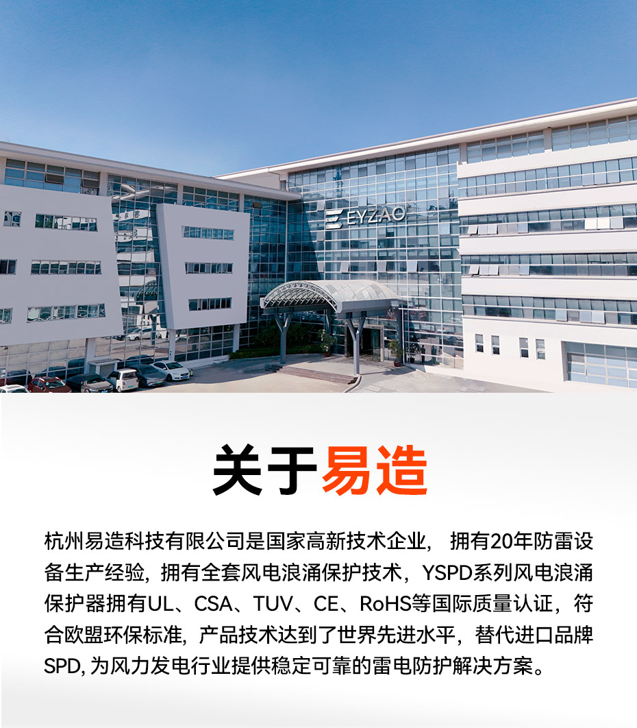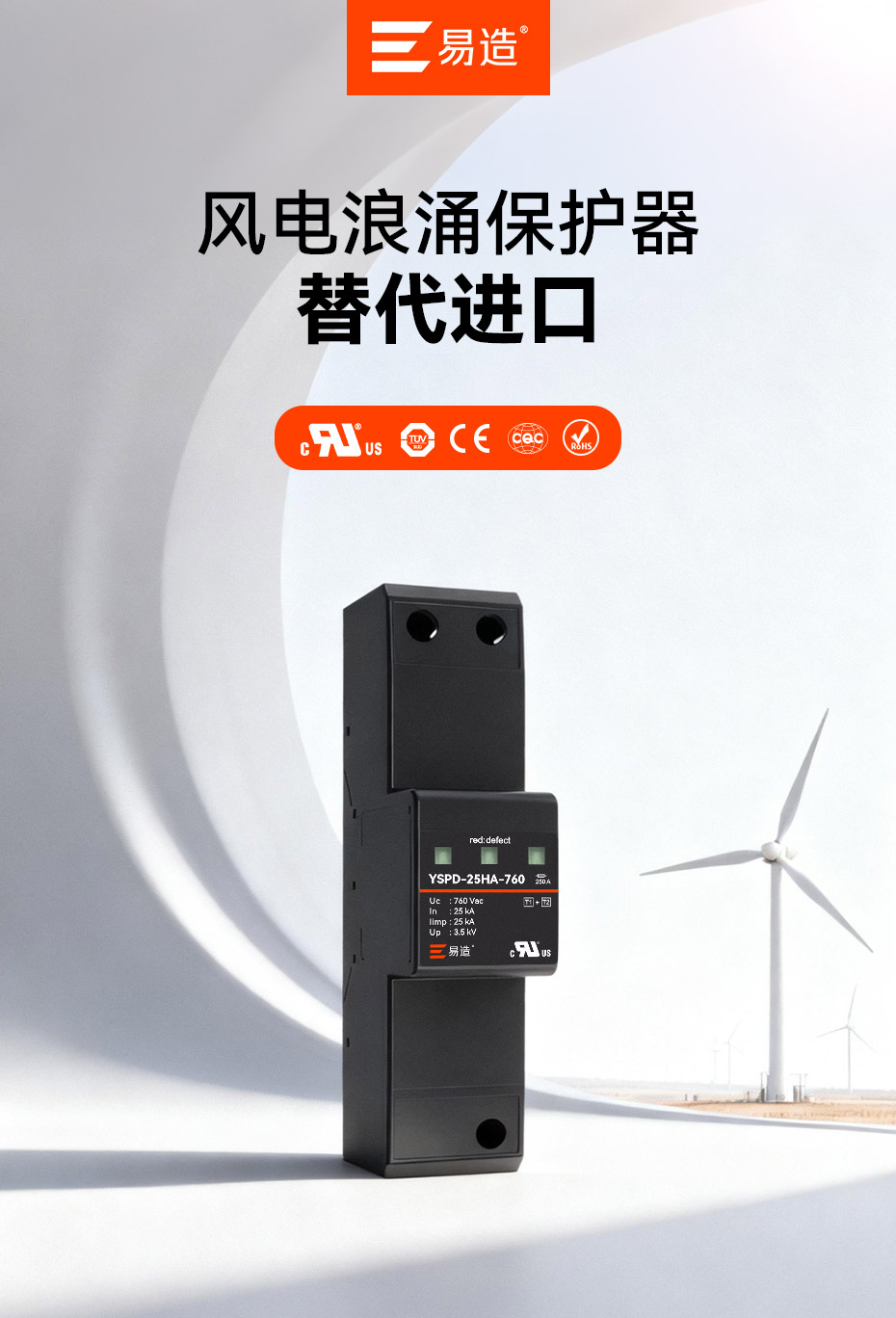 易造风电系列SPD拥有UL、TUV、CE、RoHS等国际质量认证和欧盟环保认证,可替代进口品牌SPD、支持出口,符合全球市场的最高质量和安全标准,可大大提高风力发电系统的可靠性和安全性。