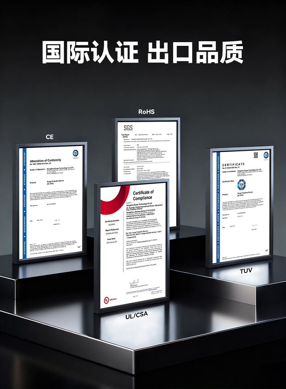 易造T1级、T2级单相浪涌保护器,规格型号齐全,拥有UL、TUV、CE、CQC等国内国际质量认证,符合全球市场的最高安全和RoHS欧盟环保标准,可替代进口品牌SPD,支持出口。