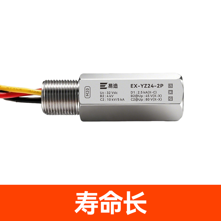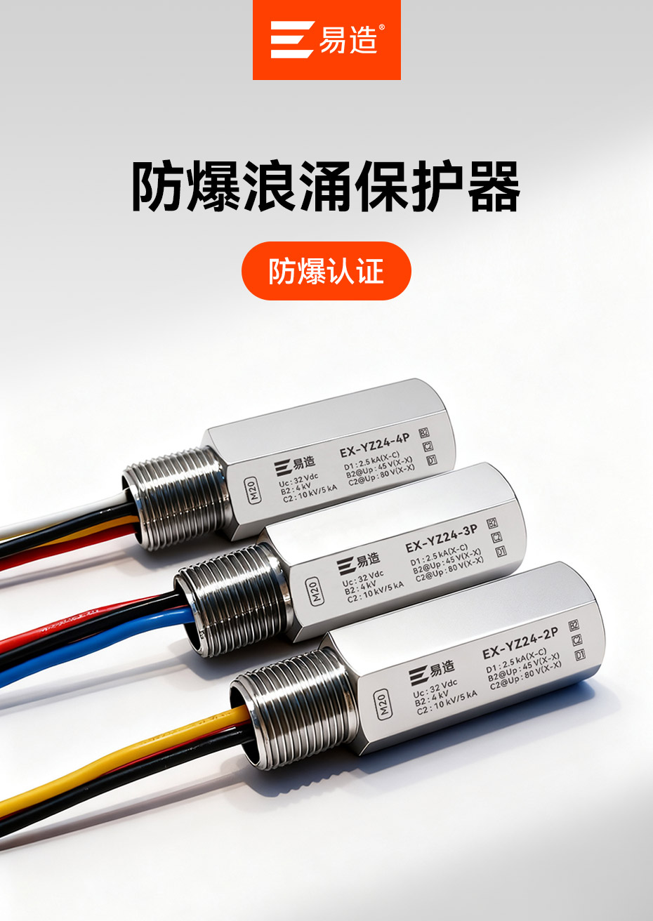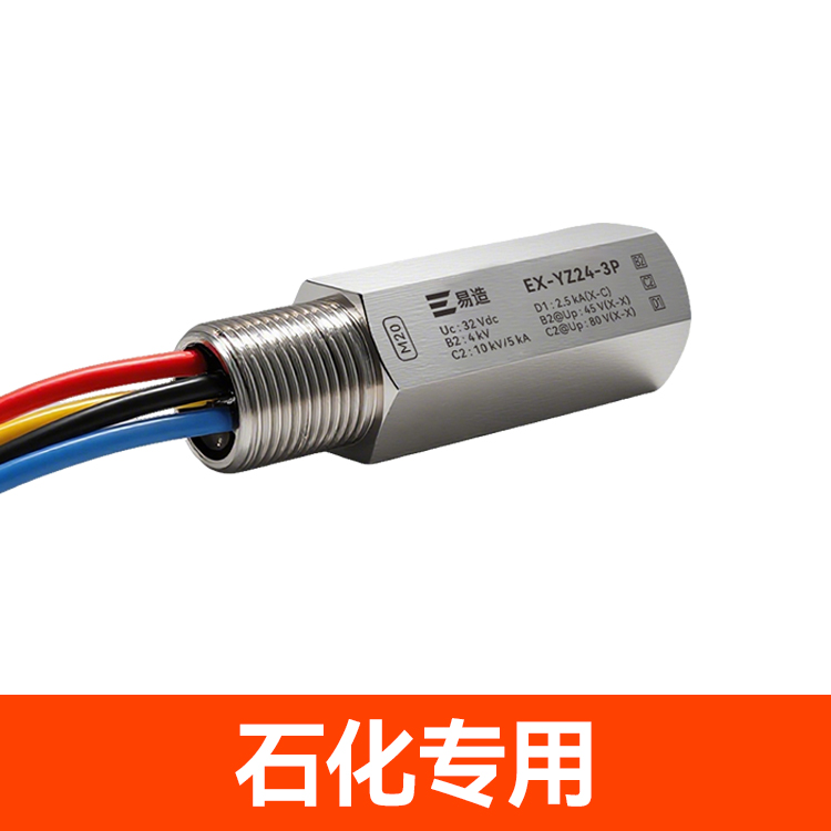 防爆浪涌保护器又名防爆信号防雷器、管式电涌保护器、现场仪表防雷器,易造Ex-YZ24系列防爆浪涌保护器依据GB/T18802.21设计,适用于石油化工、油库、天然气等易燃易爆区域及环保、新能源等行业现场仪表的电涌防护,安装接口可以根据客户的要求定制。